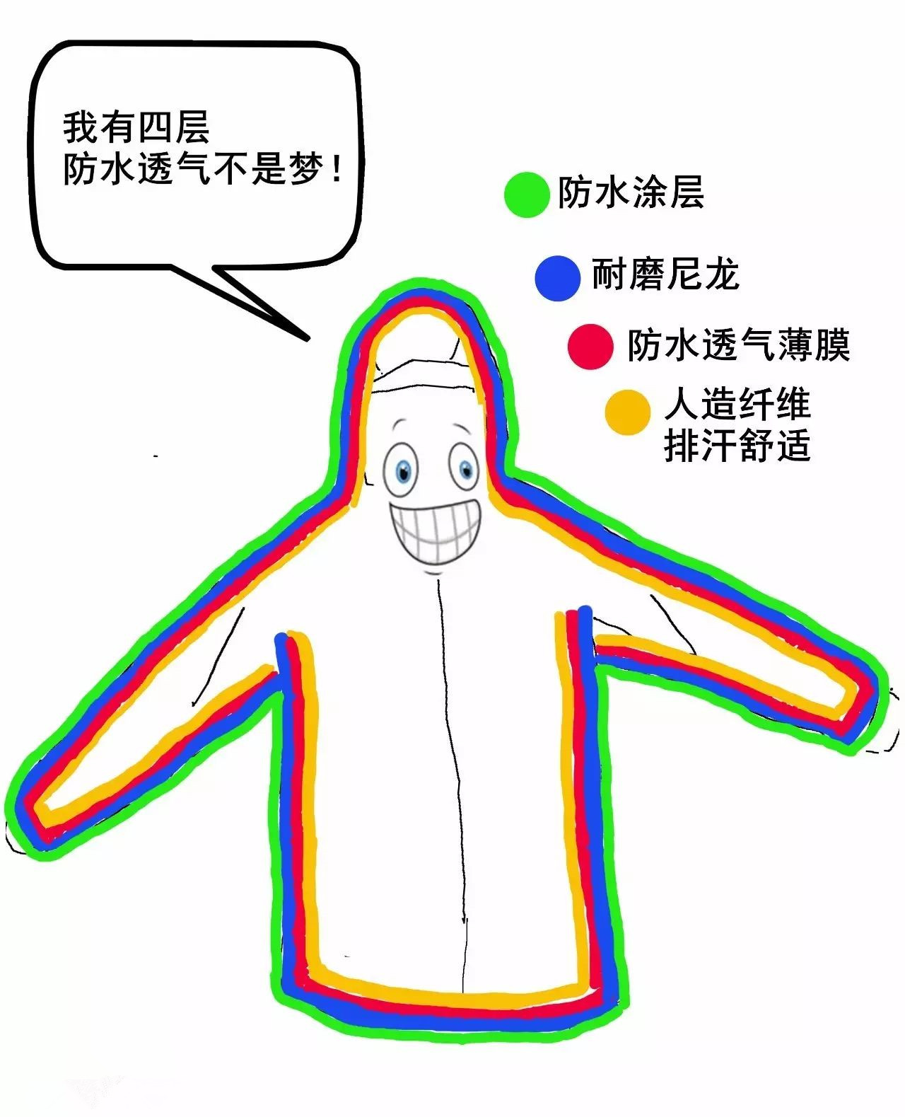 現(xiàn)代沖鋒衣通過復(fù)合的多層結(jié)構(gòu),各層之間相互配合實(shí)現(xiàn)防水透氣,同時(shí)又各司其職保證衣服舒適耐用,把防水透氣薄膜像漢堡一樣夾在最中間。由于薄膜是沖鋒衣防水透氣的核心,所以受到層層保護(hù)。如果沒有薄膜,沖鋒衣就跟普通衣服沒什么大區(qū)別了。