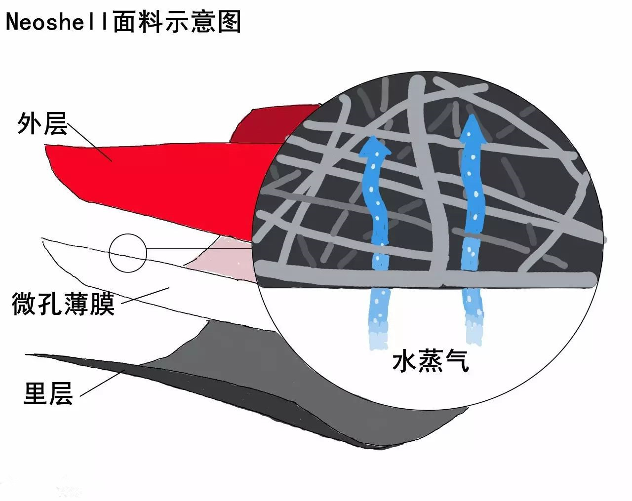 尼奧盾( Neoshell)面料原理示意圖。