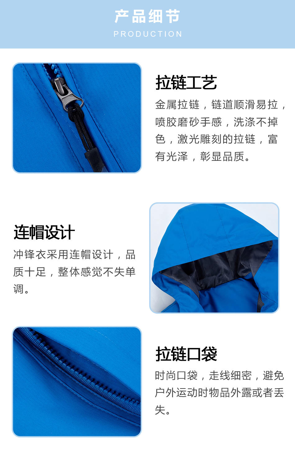• 連帽設計運動服沖鋒衣定制采用連帽設計,品質(zhì)十足,整體感覺不失單調(diào)。